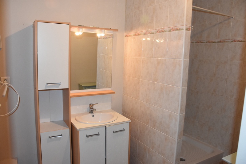La salle de bains est équipée d'un lavabo et d'une grande douche.